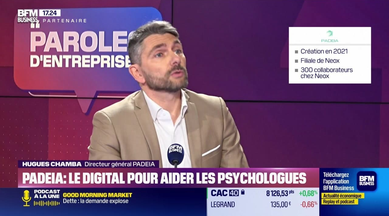 Le 31 janvier 2026, PADEIA a été mise à l’honneur dans l’émission Paroles d’Entreprises sur BFM Business. À cette occasion, Hugues Chamba, directeur général, a présenté la mission de PADEIA : mettre le digital au service des psychologues.